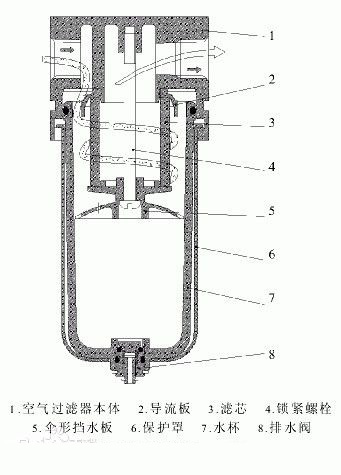空氣過濾器的結構如左圖所示 從進口流入的壓縮空氣,被引進導流板(2),